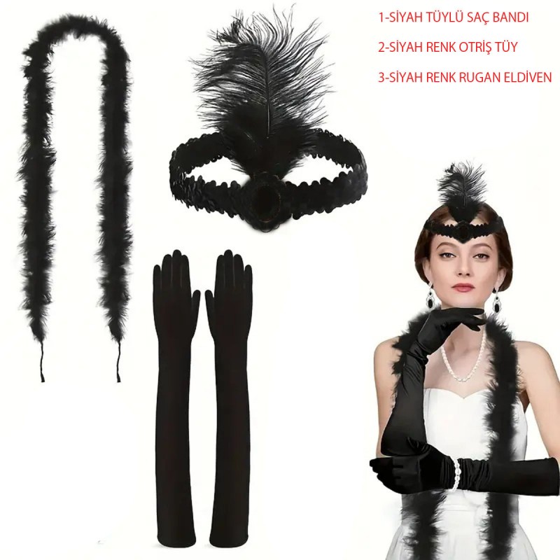 Şıklığı ve asaleti bir arada sunan Siyah 3’lü Kostüm Aksesuar Seti, özel davetler, partiler, kına geceleri, bekârlığa veda organizasyonları ve 1920’ler temalı konseptlerde tarzınızı tamamlamak için ideal bir seçimdir. Setin içinde; Siyah Tüylü Saç Bandı: Retro ve zarif görünüm için. Siyah Otriş Tüy Şal: Omuzlarınıza zarif bir dokunuş katar. Siyah Uzun Rugan Eldiven: Şıklığınızı tamamlayan klasik detay. Kadınlara özel tasarlanan bu aksesuar seti, elbiselerle mükemmel uyum sağlar ve sizi gecenin en dikkat çekici ismi yapar. Kullanım Alanları Parti ve davetler Kına gecesi ve bekârlığa veda organizasyonları Kostüm baloları Tiyatro, sahne ve gösteriler 1920’ler konseptli etkinlikler Ürün Özellikleri Renk: Siyah Set İçeriği: 3 Parça (Saç Bandı + Eldiven + Otriş Tüy) Malzeme: Rugan eldiven, tüylü şal, süslü saç bandı Kullanım: Kadın kostüm ve aksesuar seti Bu şık ve zarif aksesuar setiyle gecelerin en stil sahibi kadını siz olun!