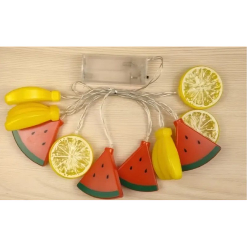 Gün ışığı renginde yanan LED’ler, enerji tasarruflu yapısıyla hem iç mekanda hem de parti, doğum günü ve konsept çekimlerde hoş bir ambiyans oluşturur. Dize üzerinde karpuz, limon ve muz gibi farklı meyve figürleri bulunur ve her bir meyve yaklaşık 6 cm boyutundadır.