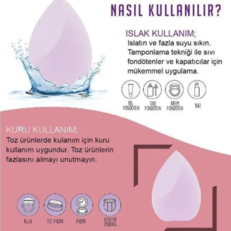 Geniş taban kısmı ile fondöten uygulamasında hızlı ve eşit dağılım sunarken, sivri uç kısmı göz altı ve burun kenarı gibi dar alanlarda kontrollü uygulama imkânı verir. Armut makyaj süngeri formu sayesinde ürün emilimini dengeler ve makyajın ciltle bütünleşmesine yardımcı olur. Yumuşak dokusu ile ciltte konforlu bir kullanım sunan 3'lü makyaj süngeri seti, hem günlük makyajda hem de profesyonel uygulamalarda tercih edilebilir.