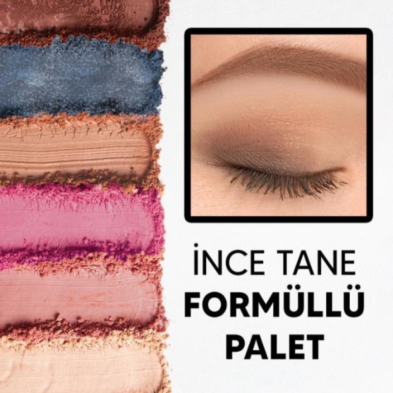 Tozutma yapmayan formül, uygulama sürecini daha temiz ve kontrollü hale getirir. İnce tane formüllü yapısı, farların göz kapağına daha dengeli yayılmasına yardımcı olur ve renk geçişlerinin daha yumuşak görünmesini destekler. Mat ve sedefli tonların bir arada bulunduğu bu palet, her ten renginde belirgin tonlar sunarak farklı cilt alt tonlarına uyum sağlar. Geniş renk yelpazesi sayesinde tek bir paletle farklı kombinler oluşturmak mümkündür; bu da paleti hem günlük kullanım hem de detaylı makyaj uygulamaları için tercih edilebilir hale getirir.