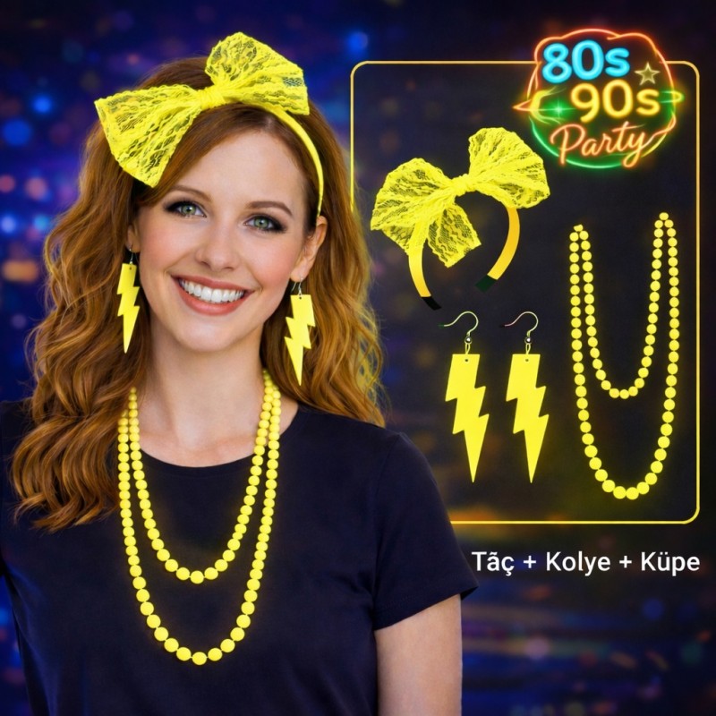 80’ler ve 90’ların enerjik ve renkli stilini yansıtan bu Neon Parti Aksesuar Seti, retro konseptli etkinlikler için mükemmel bir tamamlayıcıdır. Canlı neon renkleri sayesinde ortamda hemen dikkat çeker ve eğlenceli bir görünüm oluşturur. Set içerisinde yer alan şimşek formundaki neon küpeler, uzun neon boncuk kolye ve dantel detaylı neon taç, retro parti kombinlerini tamamlamak için özel olarak tasarlanmıştır. Konsept partiler, doğum günü organizasyonları, temalı etkinlikler ve eğlence geceleri için ideal bir aksesuardır. Paket İçeriği • 1 Adet Neon Kolye (80 cm) • 1 Çift Neon Şimşek Küpe • 1 Adet Neon Dantel Taç Ürün Özellikleri • Canlı neon renk tasarım • Hafif ve rahat kullanım • Retro 80’ler ve 90’lar konseptine uygun stil • Fotoğraf çekimleri ve parti kombinleri için ideal 80’ler ve 90’ların unutulmaz retro tarzını yansıtan bu neon aksesuar seti ile partilerde fark yaratabilirsiniz.