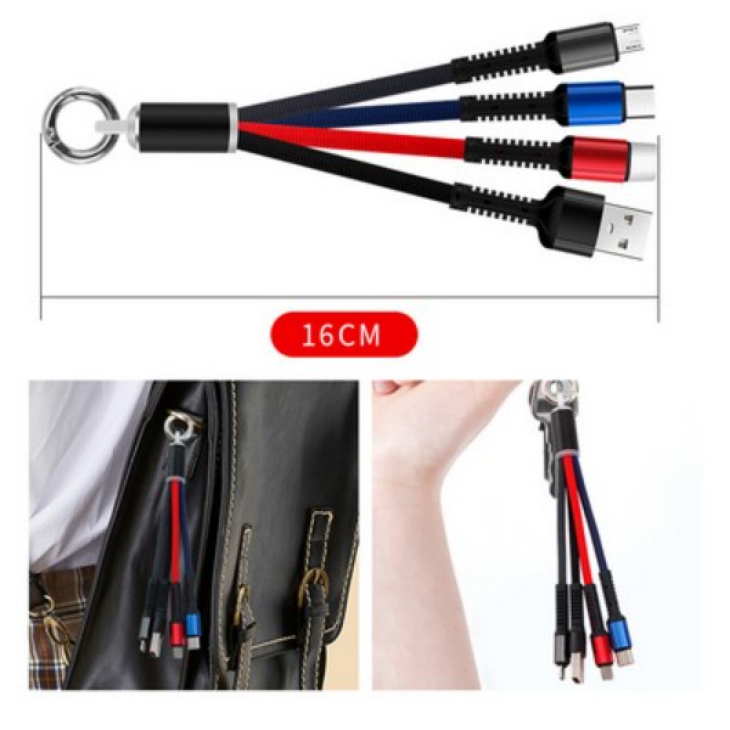 Anahtarlık Şarj Kablosu 4 Başlıklı model, kompakt tasarımıyla günlük yaşamda yanınızdan ayırmayacağınız pratik bir şarj çözümüdür. Lightning, Type-C ve Micro USB olmak üzere toplam 4 farklı başlığa sahip olması sayesinde neredeyse tüm cihazlarla uyumluluk sunar. Tek kabloyla farklı cihazları şarj edebilmek, özellikle seyahatlerde, araç içinde, ofiste veya dışarıda büyük kolaylık sağlar.