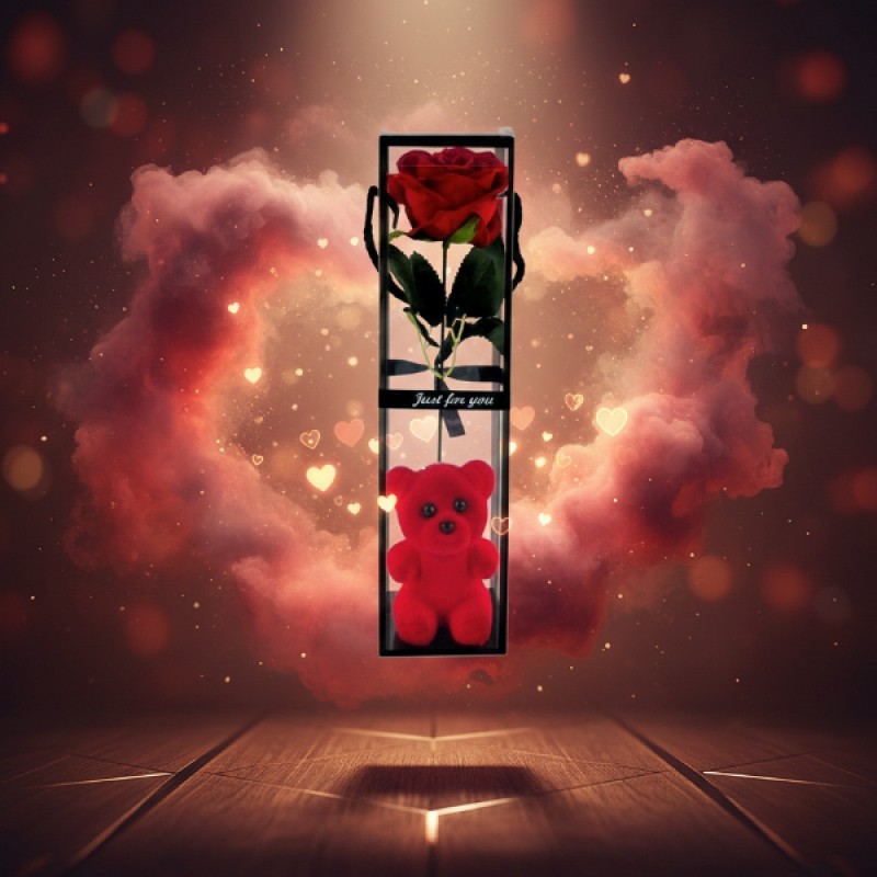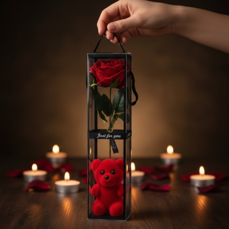 | Tasarım | Şeffaf kutu, tekli gül ve ayıcık figürü |