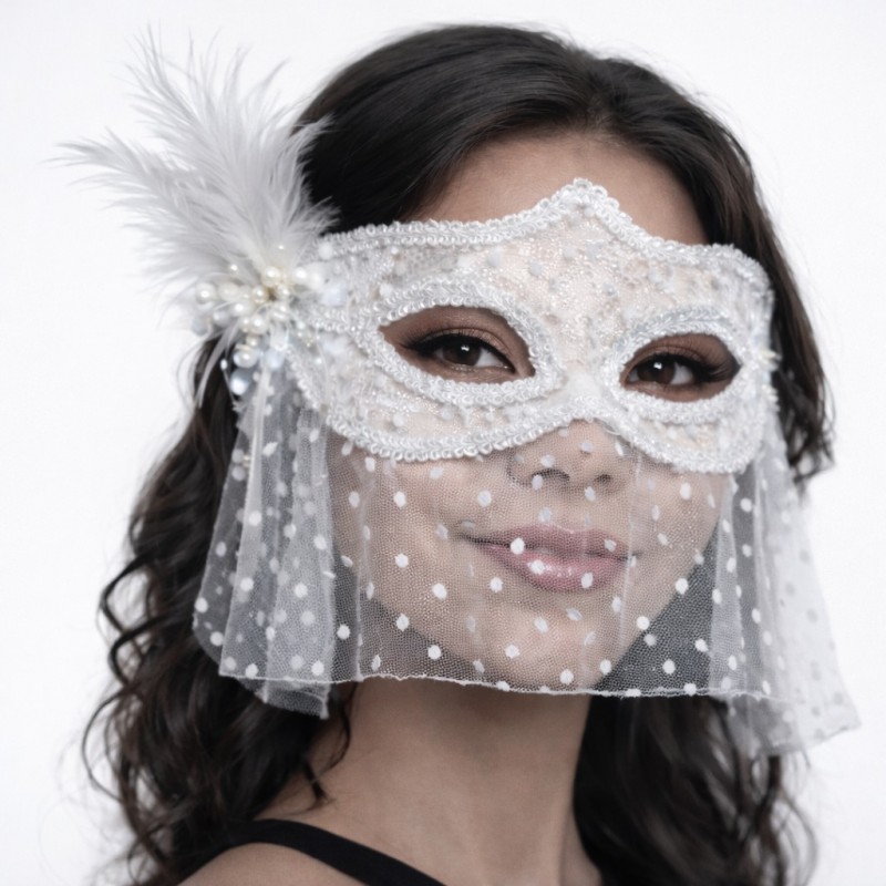 BEYAZ DANTEL TÜLLÜ PEÇELİ PARTİ MASKESİ – TÜYLÜ İNCİ DETAYLI
