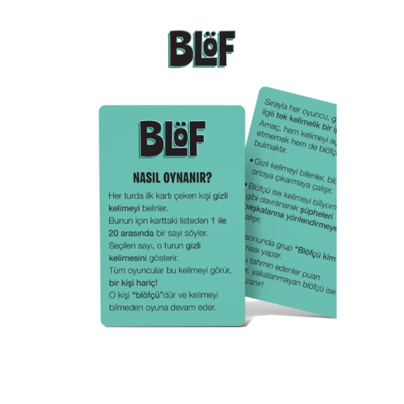 Blöf Eğlenceli Kart Oyunu, arkadaş grupları ve aileler için tasarlanmış, strateji ile eğlenceyi harmanlayan heyecan verici bir sosyal kutu oyunudur. Oyunun temel amacı, grup içindeki gizli kelimeyi bilmeyen "Blöfçü"yü tespit etmek veya eğer o kişi sizseniz, kelimeyi biliyormuş gibi davranarak grubu yanıltmaktır.
