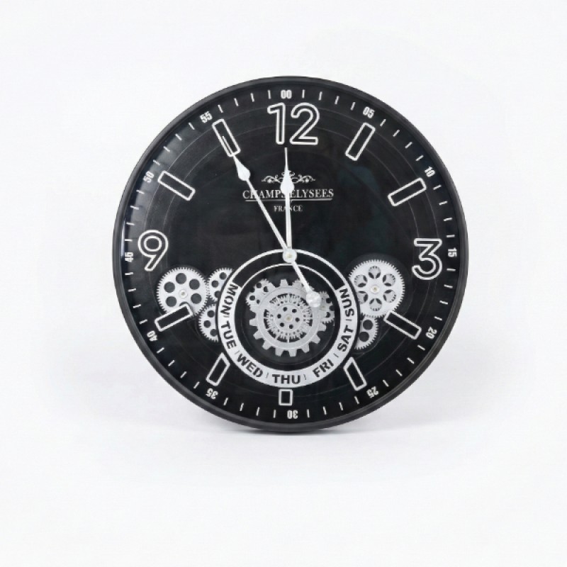 Saatin iç kısmında yer alan gümüş renkli çark detayları, mekanik estetiği vurgularken dekorasyona hareketli ve sofistike bir hava katar. Siyah zemin üzerine yerleştirilen beyaz ve gümüş tonlu rakamlar, uzaktan dahi kolay okunabilirlik sağlayarak hem estetik hem de fonksiyonel bir kullanım sunar. Dayanıklı gövde yapısı uzun süreli kullanım için tasarlanmıştır ve duvara kolayca monte edilebilir. Sessiz akan mekanizması sayesinde çalışma, dinlenme ve uyku alanlarında rahatsız edici bir ses oluşturmaz.