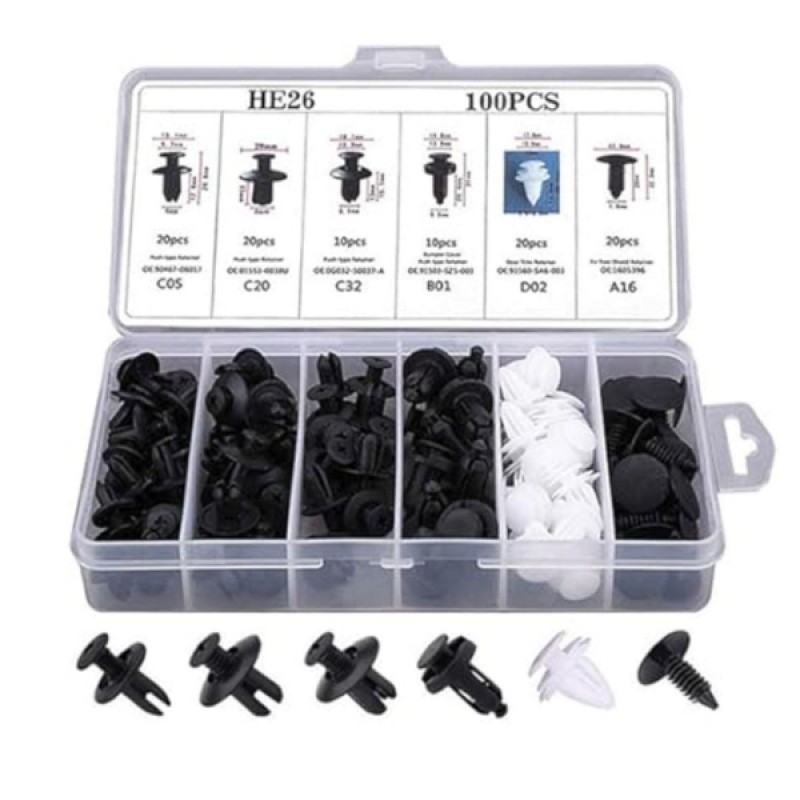 Çok amaçlı plastik bağlantı klipsi seti 100 parça, araç bakım ve onarım işlemlerinde pratik, düzenli ve güvenilir bir kullanım sunmak üzere farklı ölçü ve tiplerde oto klipsi ile plastik perçinleri bir araya getirir.