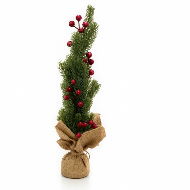 Canlı yeşil çam dallarıyla birlikte tasarlanan kırmızı kokina detayları, alt kısmındaki keten kaplı saksı görünümü ise ağaca rustik ve sıcak bir tarz kazandırır. Dayanıklı yapay malzemeden üretildiği için her yıl tekrar kullanılabilir, şeklini uzun süre korur ve dökülme yapmaz. Ev, ofis, vitrin, kafe veya hediye amaçlı kullanımlarda dekoratif bir tamamlayıcı olarak öne çıkar.