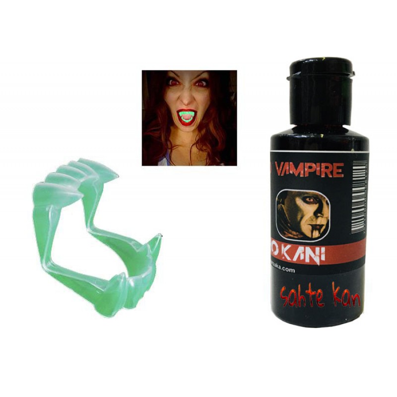 ÜRÜN ÖZELLİKLERİ Çift Damak Takma Vampir Dişi ve Tiyatro Kanı Takma Diş Ürün Malzemesi : Plastik Ürün tamamen zararsızdır Ürün Rengi : Fosforlu Yeşil Esnek Yapı Sayesinde Kolay Bir Şekilde Ürünü Takabilirsiniz Kostümlerinizi tamamlayıcı harika bir ürün Takma Diş Ürün Ölçüsü : 4 cm x 5 cm Tiyatro Kanı : 1 adet 50 gr yapay boya kan (cilde zararsızdır , gıda boyasından yapılmıştır ve ıslak mendille kolayca çıkarabilirsiniz leke bırakmaz)