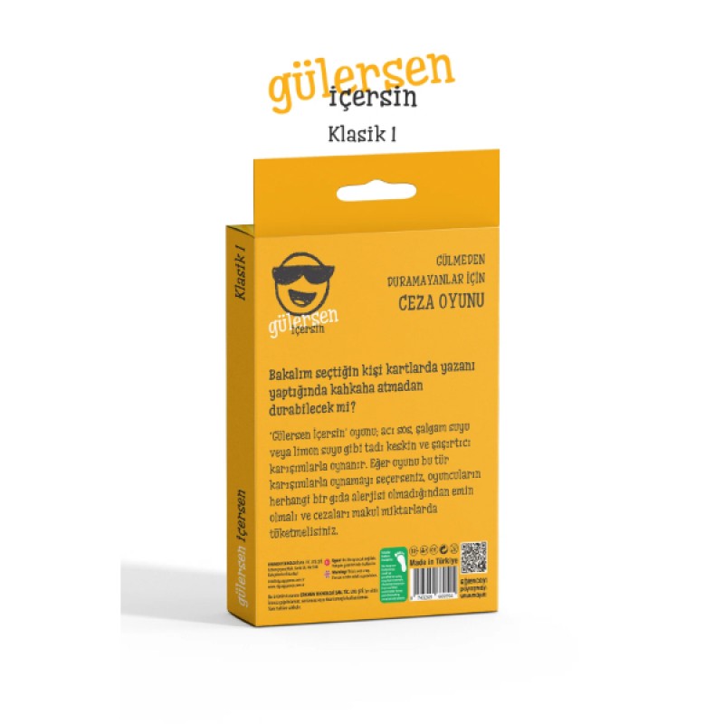 Gülersen İçersin Klasik 1, sosyal ortamlarda eğlencenin dozunu artıran, irade ve mizahın yarıştığı interaktif bir eğlence ve ceza oyunudur. "Gülmeden duramayanlar için" özel olarak hazırlanan bu set, arkadaş gruplarının ve aile toplantılarının en popüler aktiviteleri arasında yer alır. Oyunun temel amacı, belirlenen yaratıcı ve komik görevleri uygulayarak seçtiğiniz hedefi güldürmek ve ona "ceza karışımını" içirmektir. Sarı temalı ikonik tasarımı ve her yaşa hitap eden genel içerikli görev kartlarıyla bu kart oyunu, pürüzsüz bir oyun akışı sunar. Hem rakiplerinizi güldürmeye çalışırken hem de kendi ciddiyetinizi korumanız gereken bu oyun, sosyal bağları güçlendirirken kahkaha dolu anlar biriktirmenizi sağlar. Kompakt yapısı sayesinde seyahatlerde, ev partilerinde veya buluşmalarda eğlenceyi yanınızda taşıyabileceğiniz bu set, modern kutu oyunları arasında bir klasiktir.