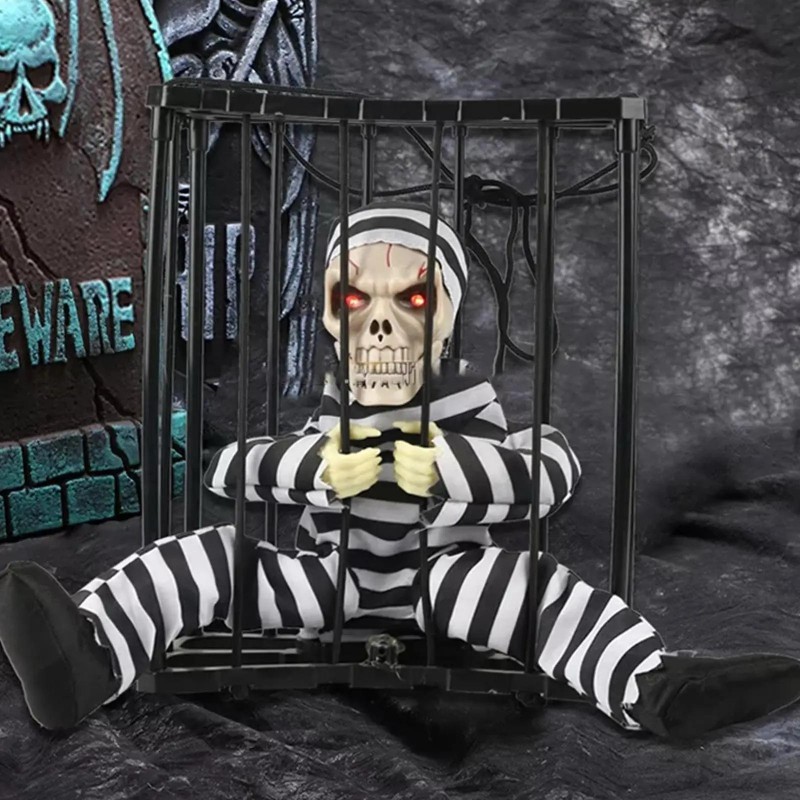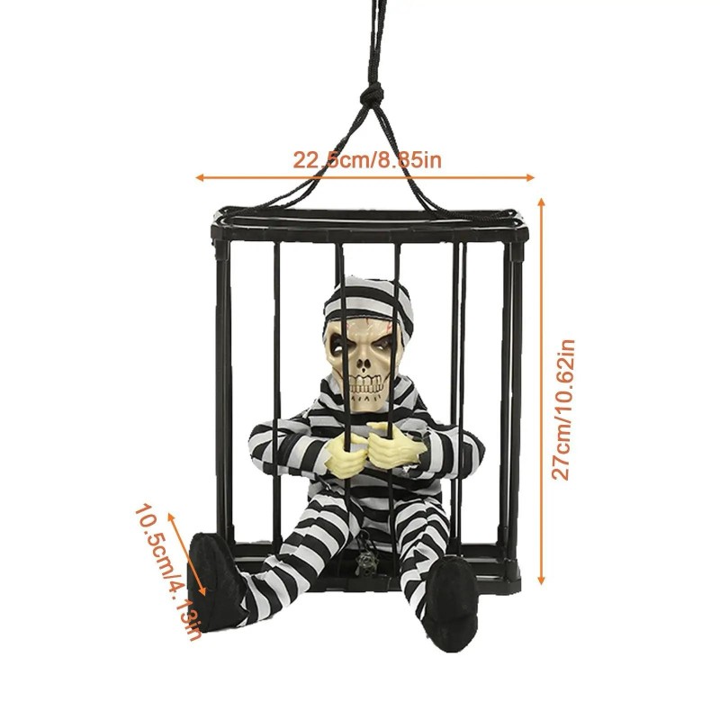 Hareketli Sesli Sensörlü Mahkum Görünümlü Kuru Kafa İskelet Dekorasyon Ürün Ölçüsü : 22x27 cm Ürün sensörlüdür , herhangi bir ses algıladığında çalışmaya başlar Ürün pil ile çalışmaktadır