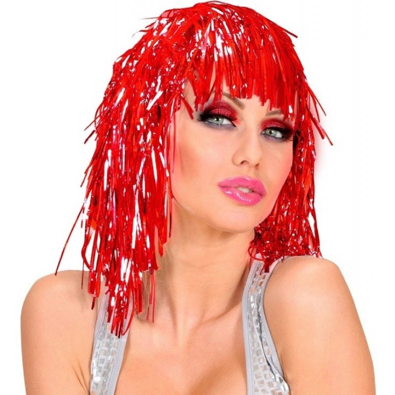 Sahnelerin yıldızı olun! Metalize kırmızı peruk, cesur ve dikkat çekici görünümüyle her ortamda fark yaratır. Parlak folyo yapısı sayesinde ışık altında büyüleyici bir ışıltı sunar.