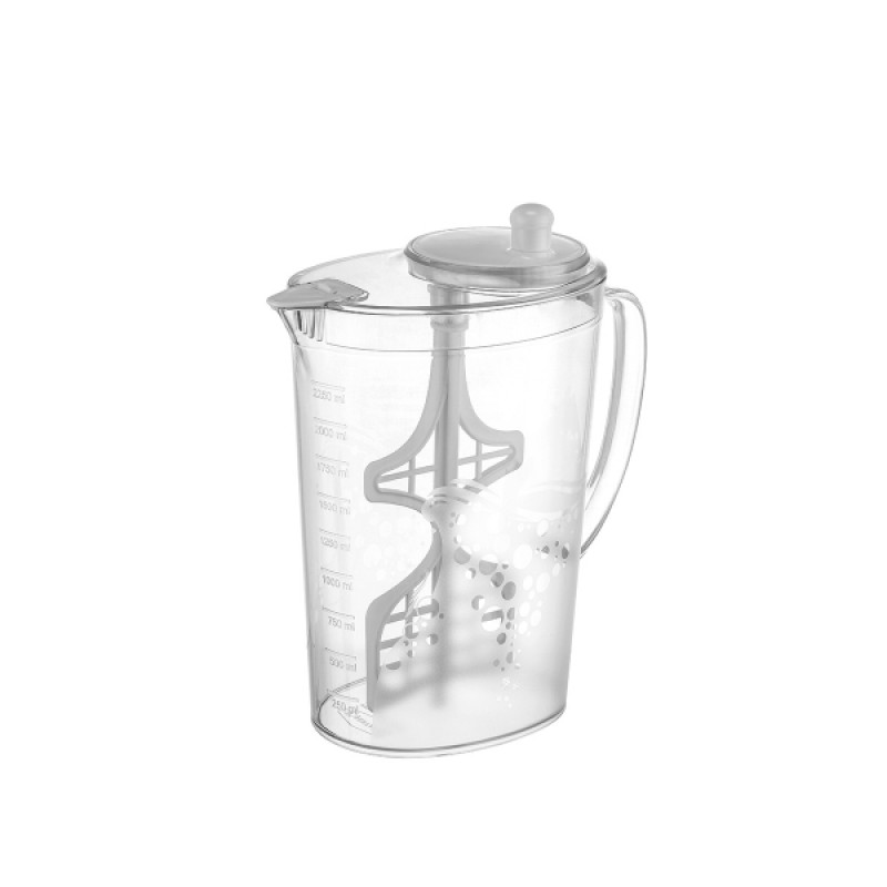 Gövde üzerinde yer alan mililitre bazlı ölçü çizgileri, tariflerinizi hazırlarken tam kıvamında sonuçlar almanıza yardımcı olur. 2,25 litrelik geniş hacmi ve kristal berraklığındaki şeffaf tasarımı ile hem hazırlık hem de servis aşamasında büyük kolaylık sunar. Ergonomik tutma sapı ve damlatma yapmayan ağız yapısı, güvenli ve temiz bir kullanım deneyimi sağlar. Yüksek kaliteli, sağlığa uygun plastik materyalden üretilen bu karıştırıcılı sürahi, dayanıklı yapısı ve şık formuyla modern mutfakların en pratik yardımcılarından biri olmaya adaydır.
