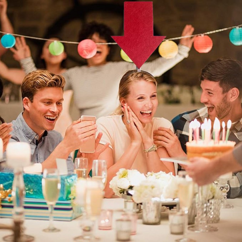 Kişiselleştirilebilir ok taç, dikkat çekici kırmızı rengi ve eğlenceli tasarımıyla parti, doğum günü, organizasyon ve özel günlerde öne çıkan bir aksesuardır.