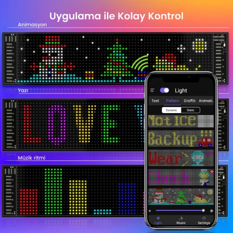 Uygulama üzerinden kolayca kontrol edilebilen bu LED ekran sayesinde yazı, desen ve animasyonlar tamamen kişisel tercihlere göre tasarlanabilir. Kullanıcılar uygulama aracılığıyla ekran parlaklığını ve animasyon hızını ayarlayabilir, farklı senaryolar için dinamik ve özgün içerikler oluşturabilir. Bu özellik, araca estetik bir görünüm kazandırırken aynı zamanda mesaj, logo veya dikkat çekici animasyonlar sergileme imkânı sunar.