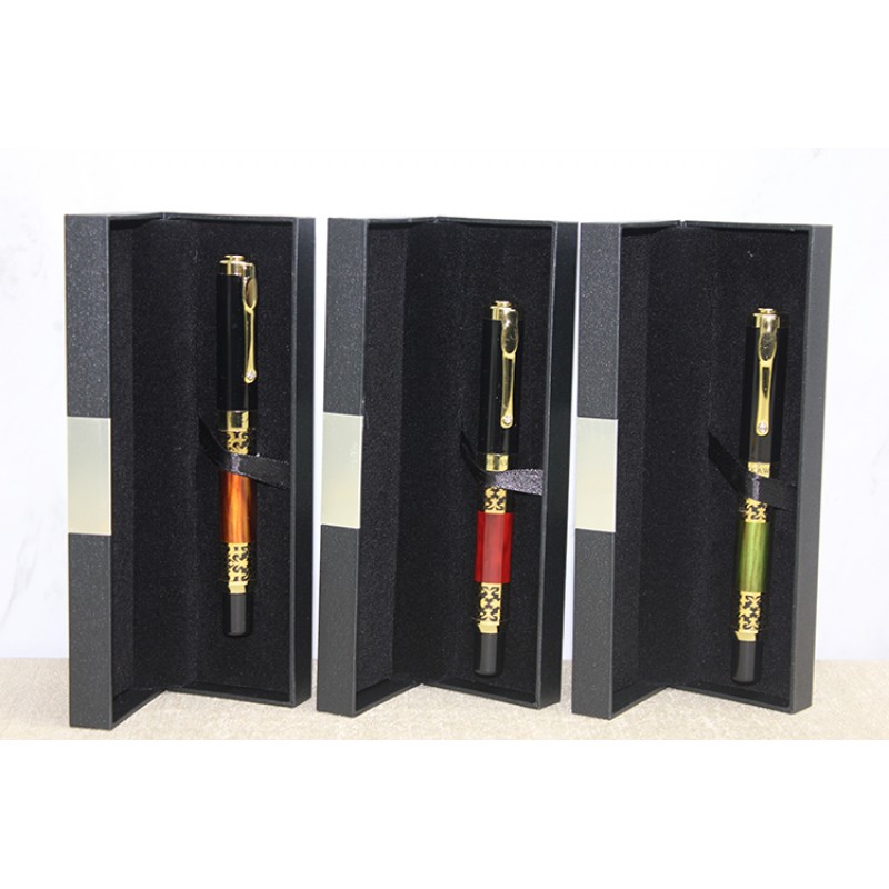 Kutulu Tekli Tükenmez Kalem Model 29, parlak siyah üst gövde ve renkli alt gövde tasarımını altın ton desen detaylarıyla birleştiren şık bir modeldir. Orta bölümde yer alan dekoratif altın motifli halka tasarımı kaleme karakteristik bir görünüm kazandırırken, canlı renkli alt gövde ürüne modern bir hava katar.