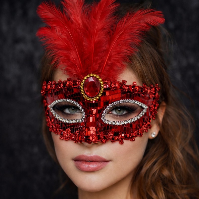 Kırmızı Renk Payetli Pullu Tüylü Parti Maskesi Ürün Ölçüsü : 17x20 cm ( Tüy Dahil ) Kaliteli plastik malzemeden üretilmiştir Maske üzeri parlak payetli pullarla kaplıdır İp aparatı sayesinde yüze göre uyum sağlar ve yüzden düşmez