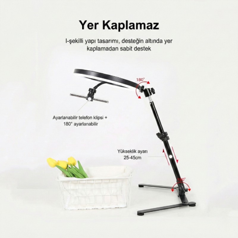 180 derece dönebilen başlığı sayesinde ışık açısı istenilen yönde ayarlanabilir ve homojen bir aydınlatma elde edilir. Ayarlanabilir telefon klipsi, farklı telefon modelleriyle uyumlu olup 180 derece hareket kabiliyeti sunarak video, fotoğraf, canlı yayın ve görüntülü görüşmelerde ideal çekim açısını yakalamanıza yardımcı olur. Masaüstü kullanım için tasarlanan bu çekim ışığı, ürün çekimleri, sosyal medya içerikleri, makyaj videoları ve online toplantılar için net, gölgesiz ve dengeli bir ışık sağlar. Dayanıklı gövdesi ve kolay kurulum özelliği sayesinde hem evde hem ofiste uzun süreli kullanım için uygundur.