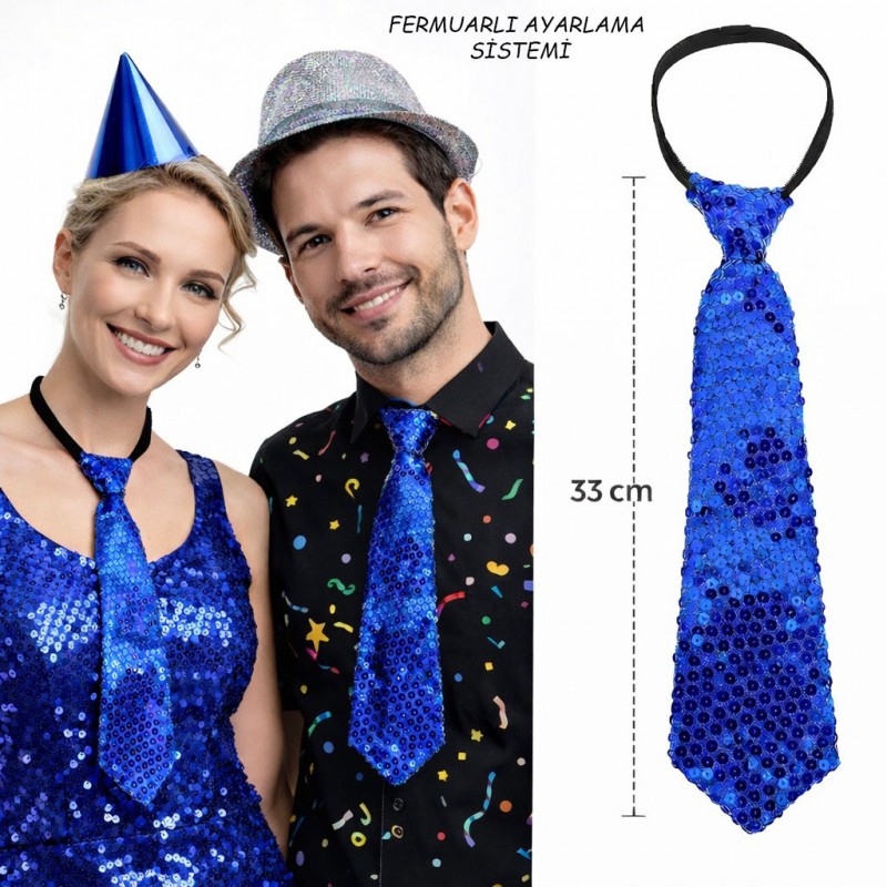 Işıltılı ve dikkat çekici bir stil arıyorsanız, mavi pul payetli parti kravatı tam size göre! Parlak ve hareketli payet yüzeyi sayesinde ışığı yansıtır ve bulunduğunuz ortamda anında fark edilmenizi sağlar. 33 cm uzunluğa sahip ideal boyutu ile hem kadın hem erkek kullanımına uygundur. Eğlence, parti, sahne performansı, doğum günü organizasyonları, konsept etkinlikler ve özel kutlamalar için mükemmel tamamlayıcı aksesuardır. Kravatın boyun kısmında bulunan fermuarlı ayarlama sistemi sayesinde kolayca takılır ve boyuna göre pratik şekilde ayarlanabilir. Lastik değil, fermuar mekanizması sayesinde daha sabit ve düzenli durur. Hafif yapısı sayesinde uzun süreli kullanımlarda rahatsızlık vermez. Ürün Özellikleri Renk: Parlak Mavi Uzunluk: 33 cm Kaplama: Pul Payet Ayarlama: Fermuarlı boyun sistemi Unisex kullanım (Kadın & Erkek) Parti ve sahne aksesuarı