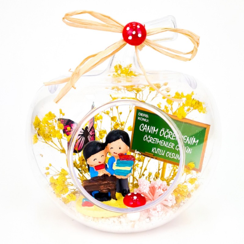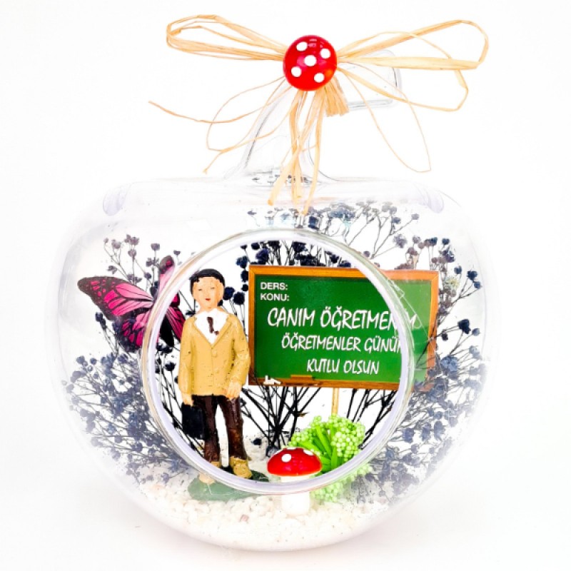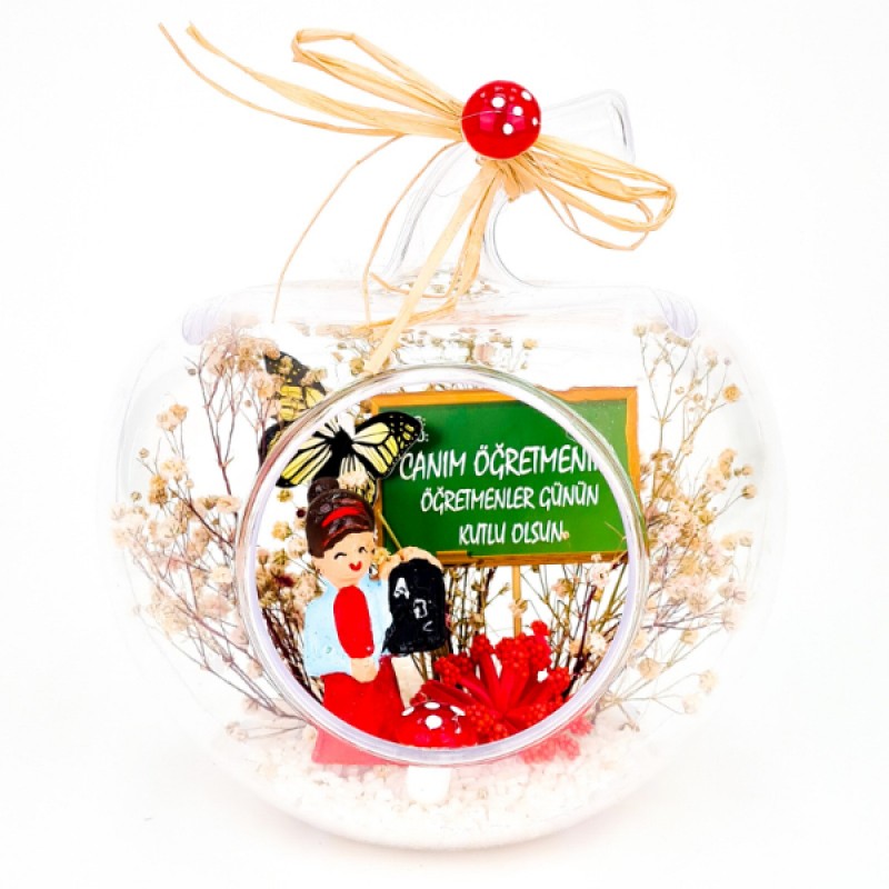 Zarif ve anlamlı tasarımıyla öne çıkan Mini Elma Teraryum, Öğretmenler Günü için hazırlanmış özel bir dekoratif hediye alternatifidir. 13x13x16 cm boyutundaki bu elma biçimli teraryum, içerisinde yer alan renkli kuru çiçekler, minyatür öğretmen figürü ve “Canım Öğretmenim” temalı tabela detayı ile şık bir görünüm sunar.
