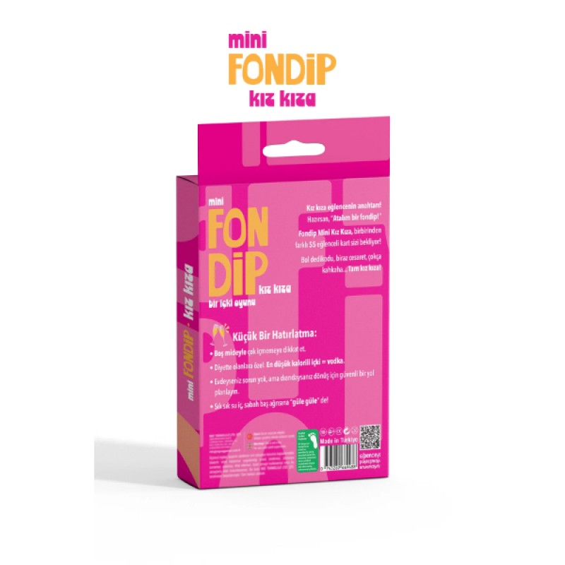 Mini Fondip Kız Kıza, kadın arkadaş gruplarının pijama partilerinden bekarlığa veda gecelerine kadar tüm buluşmalarına heyecan katacak, kompakt ve yüksek enerjili bir sosyal eğlence oyunudur. "Kız kıza eğlencenin anahtarı!" sloganıyla hazırlanan bu özel seri, kadınların dünyasına dair bolca dedikodu, biraz cesaret ve sınırsız kahkaha vaat eden 55 adet özgün kart içeriğine sahiptir. İtiraf kartlarından komik görevlere, özel durumlara yönelik shot cezalarından eğlenceli meydan okumalara kadar geniş bir yelpaze sunan bu party game, samimiyeti anında artırır. Şık pembe ve fuşya kutu tasarımı sayesinde çantanızda her yere kolayca taşıyabilir, buluştuğunuz her mekanı bir eğlence alanına çevirebilirsiniz. "Atalım bir fondip!" demeye hazırsanız, Mini Fondip Kız Kıza ile gecenin yıldızı siz olun!