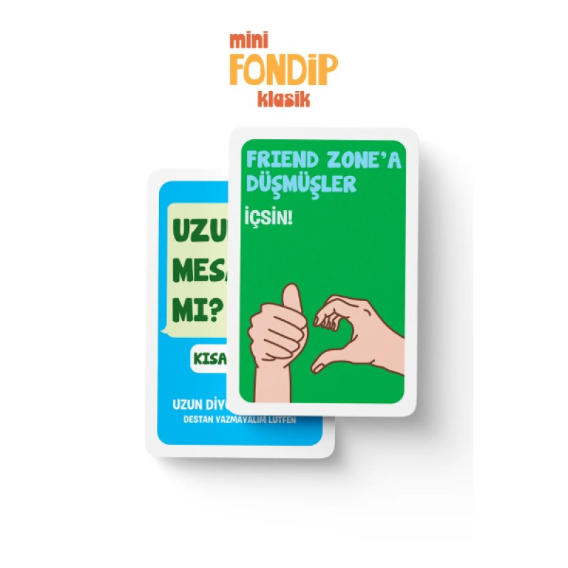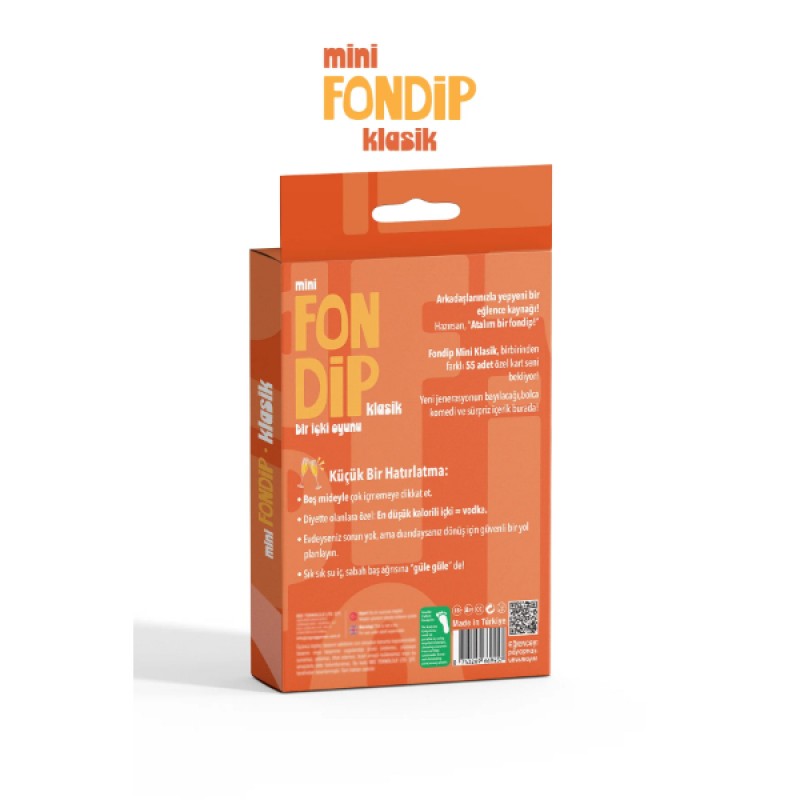 Mini Fondip Klasik, arkadaş ortamlarınızın enerjisini anında yükseltmek ve sosyal etkileşimi en üst seviyeye çıkarmak için tasarlanmış, taşınabilir ve yüksek eğlenceli bir sosyal kart oyunudur. "Atalım bir fondip!" mottosuyla hazırlanan bu özel seri, 55 adet özgün ve komik kart içeriğiyle klasik parti oyunlarına modern bir dokunuş katar. Deste içerisinde yer alan yaratıcı görevler, itiraflar ve grup içi etkileşimi artıran meydan okumalar sayesinde gecenin temposu her kartta daha da yükselir. Turuncu temalı enerjik kutu tasarımı ve kaliteli kart basımıyla öne çıkan bu party game, kompakt yapısı sayesinde cebinizde veya çantanızda her yere kolayca taşınabilir. Ev partilerinden kamplara, tatillerden hafta sonu buluşmalarına kadar her anı unutulmaz bir kahkaha şölenine dönüştürmek için Mini Fondip Klasik en ideal yol arkadaşınızdır.