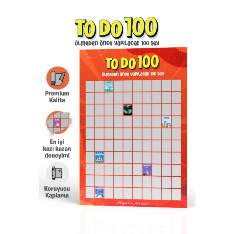 Ölmeden Önce Yapılacak 100 Şey Kazı Kazan Posteri, hayatınıza macera, heyecan ve yeni deneyimler katmak için tasarlanmış ilham verici bir rehberdir. "Hayat kısa, liste uzun!" mottosuyla yola çıkan bu interaktif poster, dünyanın en ilginç aktivitelerini, görülmesi gereken yerlerini ve deneyimlenmesi gereken anlarını tek bir tabloda topluyor. Premium kalitede kağıt üzerine özel koruyucu kaplama ile üretilen bu poster, şık tasarımıyla odanızın dekorasyonuna modern bir hava katar.