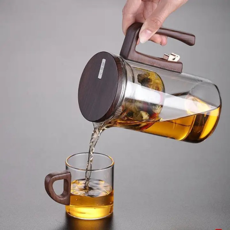 Dayanıklı borosilikat cam malzemeden üretilen demlik, yüksek sıcaklıklara karşı dirençlidir ve uzun ömürlü kullanım imkânı sunar. Ergonomik ahşap görünümlü sapı, güvenli bir tutuş sağlarken şık görünümüyle her mutfağa zarafet katar. Paslanmaz çelik filtresi sayesinde doğal bir demleme sağlar ve çayın aromasını korur.