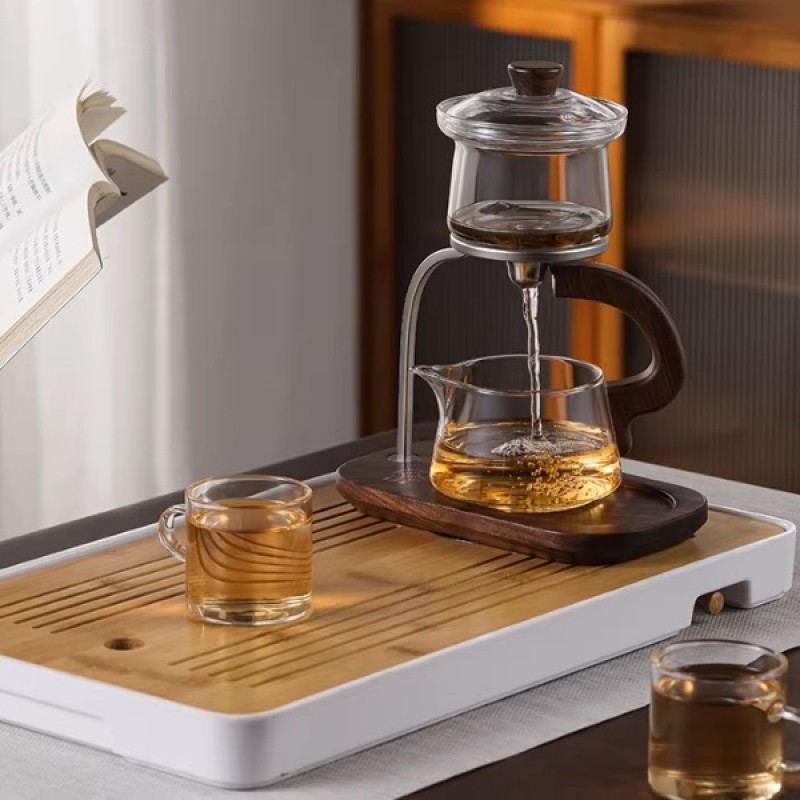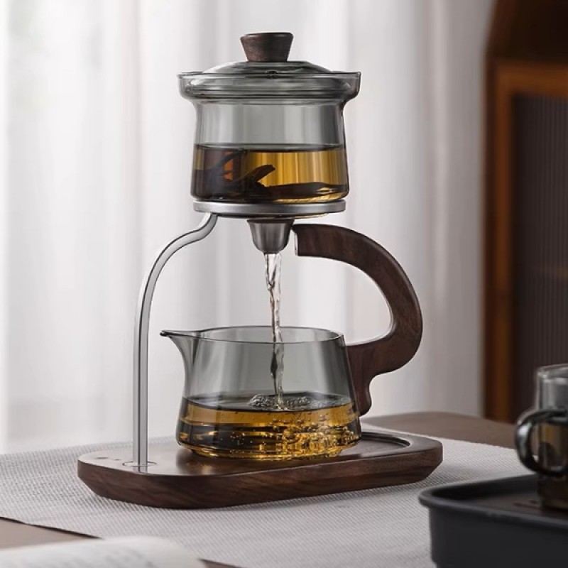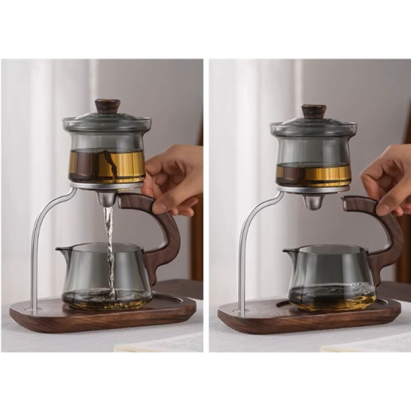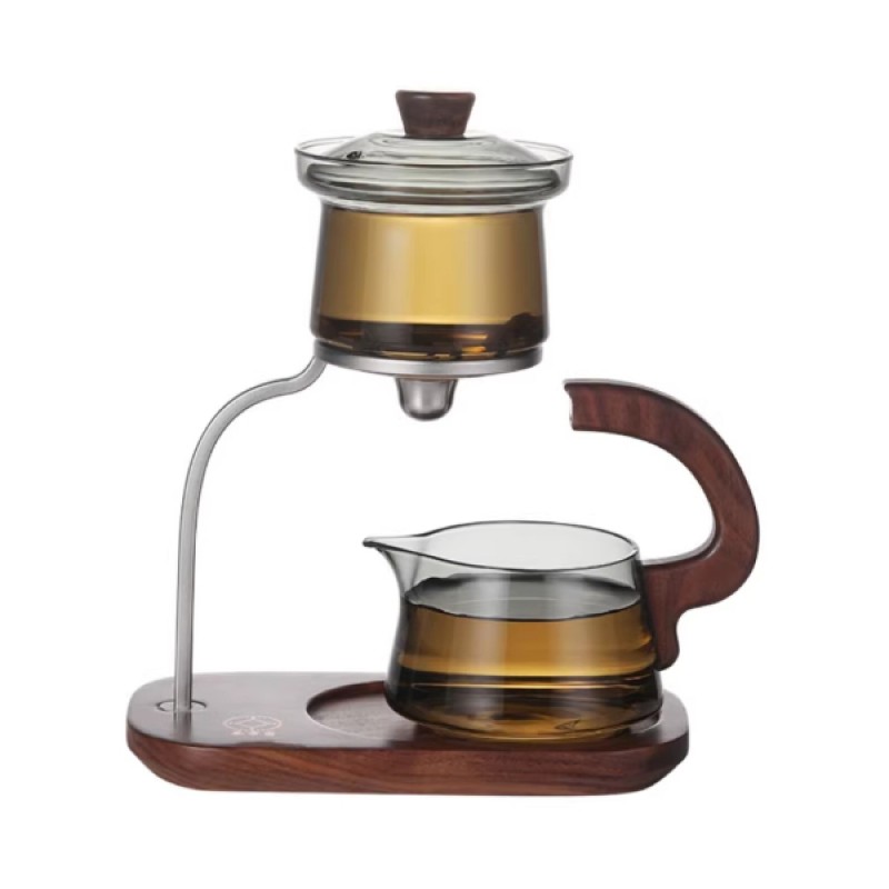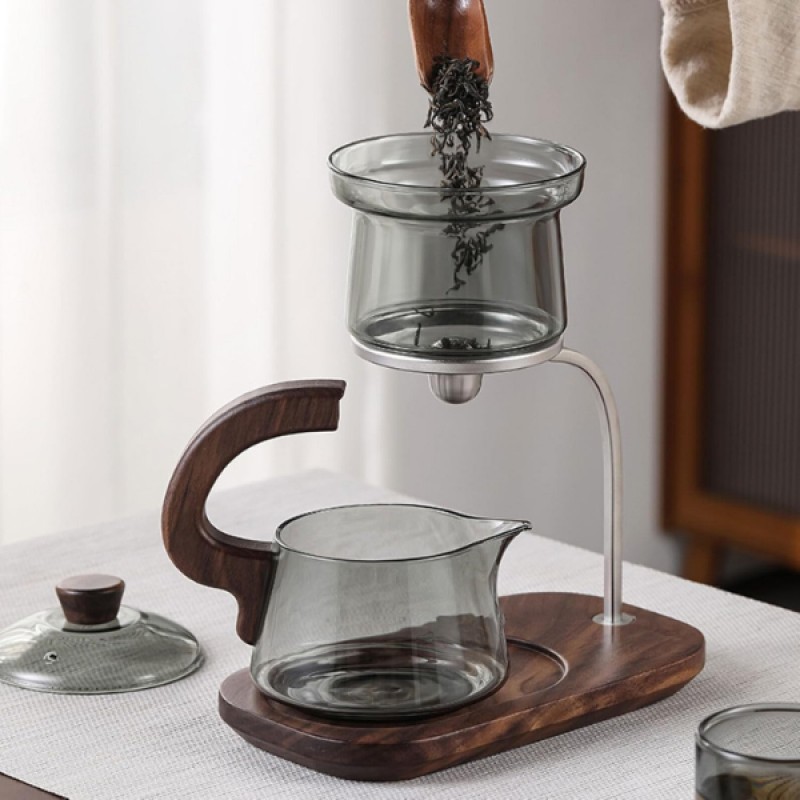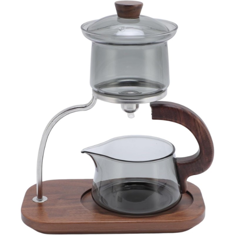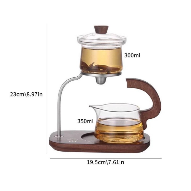 Manyetik otomatik akış sistemiyle donatılan üst demlik, alt hazneye çayı kontrollü bir şekilde aktarır. Bu özellik, hem taşırmadan hem de damlatmadan pratik kullanım imkânı sunar. Modern tasarımlı ahşap taban ve metal destekli standı, mutfakta veya misafir sofralarında dekoratif bir görünüm oluşturur.