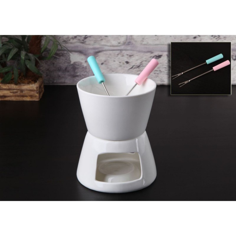 Alt kısmında yer alan mum haznesi, içerideki çikolata veya peyniri ideal sıcaklıkta tutar; böylece fondü keyfi uzun süre devam eder. Renkli saplara sahip iki adet metal çatal, hem pratik hem de estetik bir kullanım sunar. Bu sayede meyvelerinizi, marshmallow’larınızı veya atıştırmalıklarınızı hijyenik ve rahat bir şekilde fondüye batırabilirsiniz.
