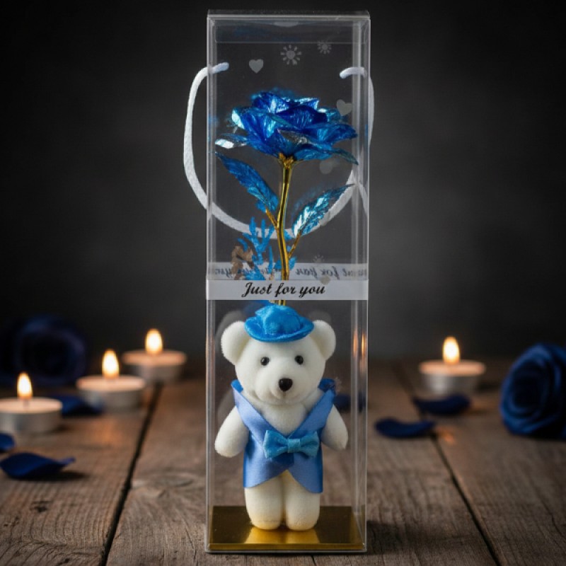 Şeffaf kutulu ayıcıklı sonsuzluk gülü, özel günlerde kalıcı ve anlamlı bir hediye sunmak isteyenler için tasarlanmış dekoratif bir aranjmandır. Şeffaf koruyucu kutu içerisinde yer alan metalik görünümlü gül ve sevimli ayıcık detayı, ürüne şık ve dikkat çekici bir görünüm kazandırır. Uzun saplı gül tasarımı ile klasik buket formunu modern bir sunumla birleştirir. İç kısmında bulunan ayıcık strafor malzemeden üretilmiştir ve dekoratif amaçlı kullanıma uygundur. Ayıcıklı sonsuzluk gülü tasarımı sayesinde sevgililer günü, doğum günü, yıl dönümü ve özel kutlamalarda tercih edilebilir. Masa, vitrin ve raf üzerinde sergilenebilen şeffaf kutulu dekoratif gül, uzun süre formunu koruyarak kalıcı bir hatıra niteliği taşır.