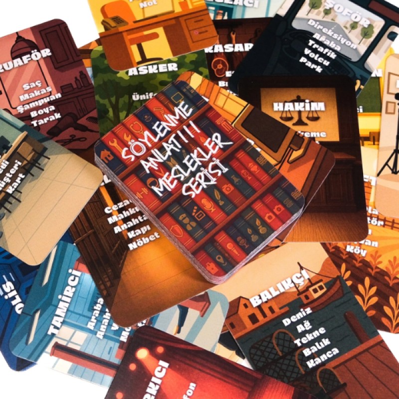 Söylenme Anlat Meslekler Serisi, toplumun yapı taşları olan çeşitli iş kollarını ve uzmanlık alanlarını eğlenceli bir rekabete dönüştüren kelime anlatma ve tahmin oyunudur. Kuaförden hakime, balıkçıdan tamirciye kadar geniş bir meslek yelpazesini içeren bu set, oyuncuların ifade yeteneğini ve genel kültür bilgisini zorlar. Her kartta yer alan tematik illüstrasyonlar ilgili mesleğin atmosferini yansıtırken, kart altındaki yasaklı kelimeler anlatıcıyı daha yaratıcı yollar bulmaya sevk eder. Hem çocuklar için eğitici bir kariyer tanıma aracı hem de yetişkinler için yüksek tempolu bir party game olan bu seri, sosyal becerileri geliştirmek için tasarlanmıştır. Şık kutusu ve kompakt yapısıyla her yere taşıyabileceğiniz bu oyunla, en zor meslekleri en kısıtlı kelimelerle anlatma heyecanına ortak olun!