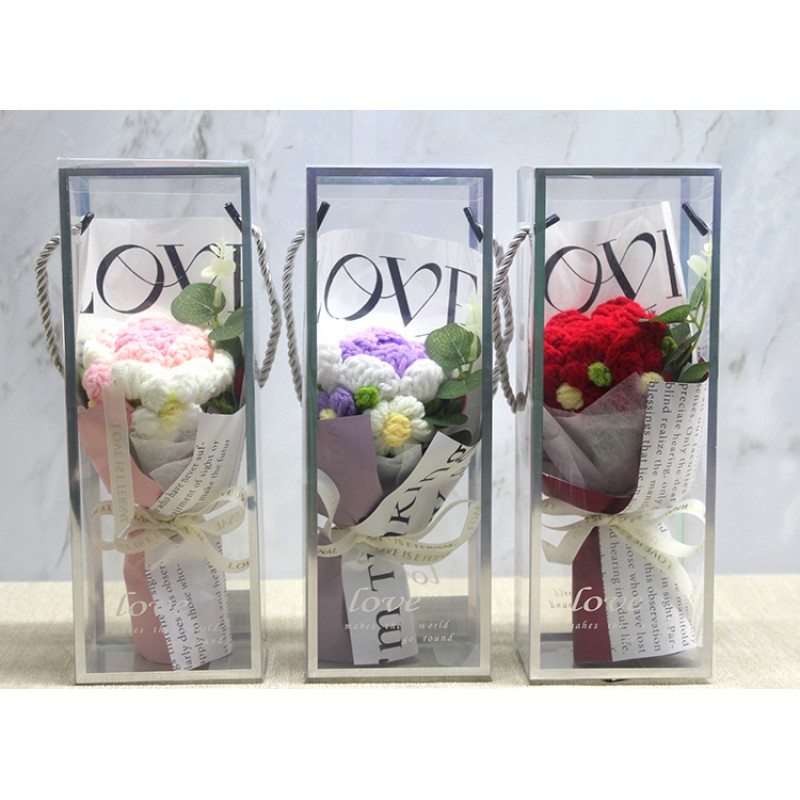 24x9 cm boyutundaki ideal ölçüsü sayesinde masa üstü dekorlarında, hediye sunumlarında, özel gün kutlamalarında ve fotoğraf çekimi konseptlerinde zarif bir tamamlayıcı olarak kullanılabilir. Örgü gül detayının yumuşak dokusu ürüne sıcak ve romantik bir görünüm kazandırırken, şeffaf kutulu sunumu ürünü hediye edilmeye hazır özel bir aranjman haline getirir. Kurdele ve dekoratif etiket detayları tasarıma estetik bir hava katarken, el işçiliği sayesinde her bir buket kendine özgü bir karakter taşır.