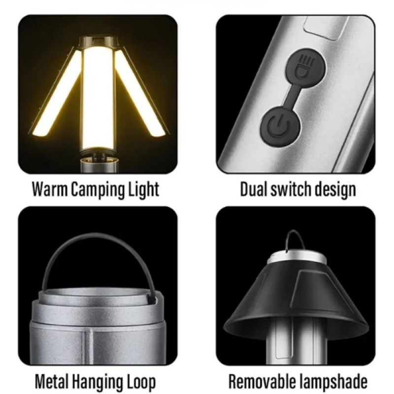 Teleskopik yapısı sayesinde el feneri, masa lambası ve zemin lambası olarak kullanılabilen ürün, farklı ihtiyaçlara hızlıca uyum sağlar. Sahip olduğu 270 derece ayarlanabilir lamba kanatları, yumuşak ve homojen ışık dağılımı sağlayarak gece okumaları ve geniş alan aydınlatmaları için idealdir. Yakınlaştırılabilir el feneri modu ile hem yakın hem de uzak mesafelerde etkili görüş sunar. Dahili gizli kanca detayı sayesinde çadırlara veya ağaç dallarına kolayca asılabilir. Type-C hızlı şarj arayüzü ile pratik şarj imkânı sunan bu model, şarj edilebilir kamp ışığı arayanlar için fonksiyonel ve uzun ömürlü bir çözümdür.