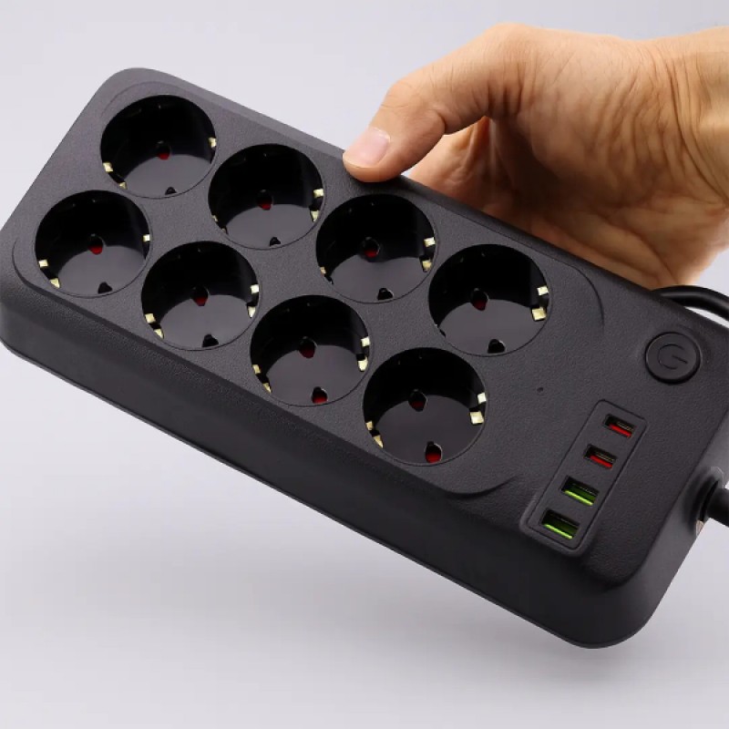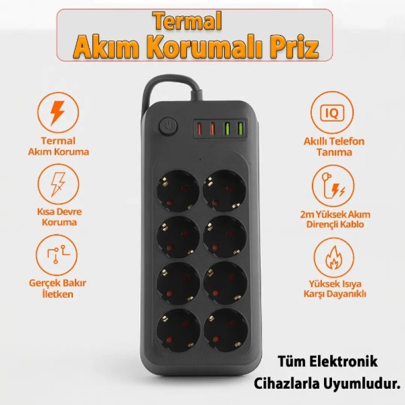 Değerli elektronik cihazlarınızı güvence altına alın! Termal Akım Korumalı 8 Prizli Uzatma Kablosu, yüksek teknolojili koruma sistemleri ile hem evinizde hem de ofisinizde güvenli bir enerji istasyonu kurmanızı sağlar. 8 adet AC priz girişinin yanı sıra üzerinde yer alan 4 adet USB girişi, akıllı telefon ve tabletlerinizi adaptör gerektirmeden şarj etmenize olanak tanır. Akıllı telefon tanıma (IQ) teknolojisi sayesinde cihazınıza uygun akımı otomatik olarak belirleyerek pil sağlığını korur. Termal akım koruması ve kısa devre koruması özellikleri, ani voltaj dalgalanmalarında ve aşırı yüklenmelerde elektriği keserek cihazlarınızın zarar görmesini engeller. 2 metre uzunluğundaki yüksek akım dirençli kablosu ve gerçek bakır iletkenleri ile maksimum verimlilik sunan bu ürün, yüksek ısıya dayanıklı gövde yapısı sayesinde uzun ömürlü ve güvenilir bir kullanım vaat eder.
