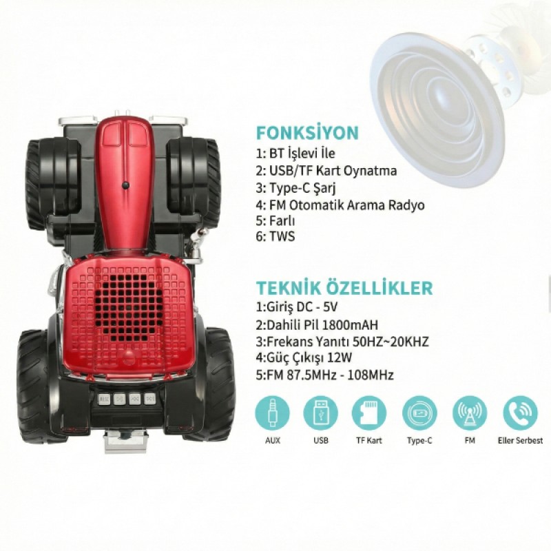 Traktör tasarımlı Bluetooth hoparlör, güçlü ses çıkışı ve dikkat çekici gerçekçi traktör formu ile hem eğlenceli hem de işlevsel bir kullanım sunar. Bluetooth bağlantı özelliği sayesinde akıllı telefon, tablet ve diğer uyumlu cihazlarla hızlıca eşleşerek kablosuz müzik deneyimi sağlar.