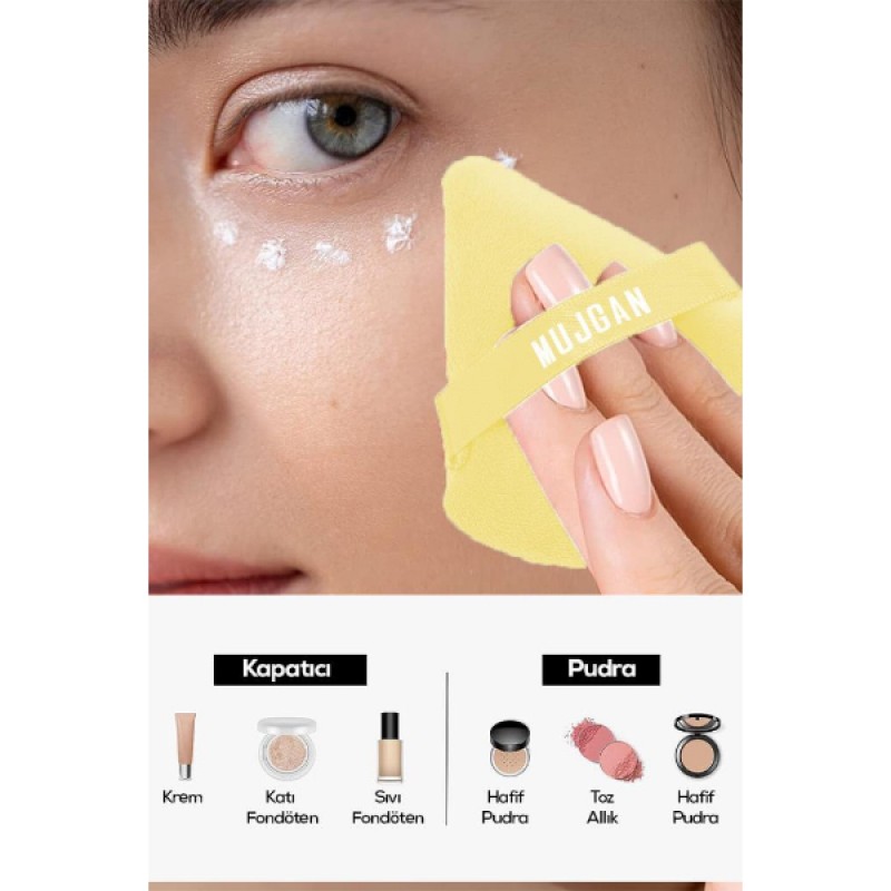 Üçgen makyaj süngeri puf, ten makyajını daha kontrollü ve pratik şekilde uygulamak için tasarlanmış çok yönlü bir makyaj aksesuarıdır. Özel üçgen formu sayesinde göz çevresi, burun kenarları ve çene gibi detaylı bölgelerde hassas uygulama imkânı sunar. Sivri uç kısmı dar alanlara kolayca ulaşırken, geniş ve dairesel yüzeyi yanaklar, alın ve diğer geniş bölgelerde fondötenin eşit şekilde dağıtılmasına yardımcı olur.