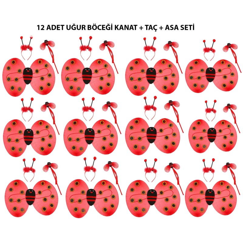 12 Adet Uğur Böceği Kostüm Seti (Her Set: 1 Adet Kanat, 1 Adet Taç, 1 Adet Asa)