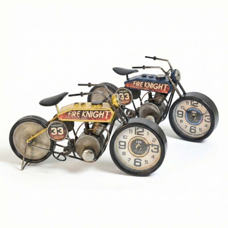 Yarış motoru tasarımlı masaüstü saat, hız ve yarış ruhunu dekoratif bir obje formunda yaşam alanlarına taşıyan özgün bir tasarıma sahiptir. Klasik yarış motosikletlerinden ilham alınarak hazırlanan gövde yapısı, metal görünümlü motor bloğu, geniş jant detayları, egzoz ve sele tasarımıyla gerçekçi ve koleksiyonluk bir görünüm sunar. Ön tekerlek kısmına entegre edilmiş analog saat mekanizması, büyük ve net rakamları sayesinde kolay okunabilirlik sağlarken dekoratif bütünlüğü bozmadan işlevsellik kazandırır.