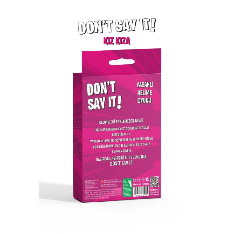Don’t Say It! Kız Kıza, kadın arkadaş gruplarının pijama partilerinden hafta sonu buluşmalarına kadar her anına heyecan ve kahkaha katacak, yüksek tempolu bir yasaklı kelime anlatma oyunudur. Kadınların dünyasına özgü güncel kavramlar, sosyal medya terimleri ve eğlenceli başlıklarla hazırlanan bu set, klasik tabu mantığını modern bir "kız kıza" konseptiyle buluşturur. Oyunun temel amacı, kartın üzerindeki "Flört", "Selfie", "Feminist" gibi anahtar kelimeleri, altında yer alan yasaklı kelimeleri kesinlikle kullanmadan anlatmaktır. Canlı fuşya tasarımı ve kadınlara özel dinamik içerikleriyle sunulan bu kart oyunu, hızlı düşünme yeteneğinizi zorlarken sosyal bağlarınızı güçlendirir. Kompakt boyutu sayesinde çantanızda her yere taşıyabileceğiniz bu oyun, arkadaşlarınızla bir araya geldiğinizde eğlenceyi anında başlatmanız için tasarlandı. Hazırsan nefesini tut, yasaklı kelimelere dikkat et ve takımını zafere taşı!